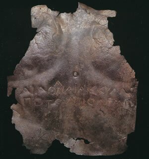 Artifact: A Southern Italian Greek bronze 'cuirass' worn on the back. The inscription says 'To Athena, spoils from the enemy'. It has been dated between 400 - 370 B.C. |